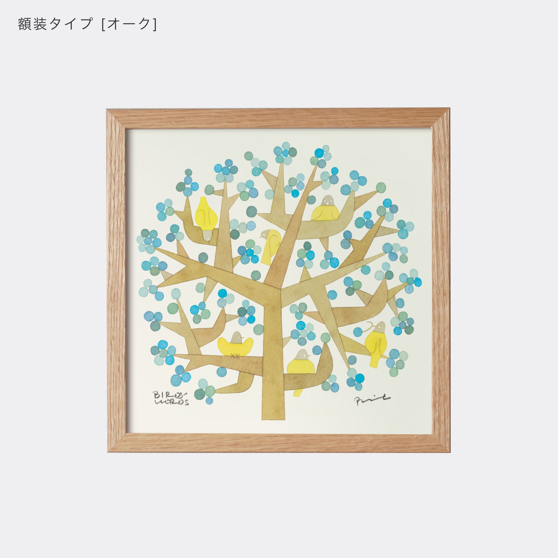 たくさんの実をつけた木の上で、鳥たちが穏やかな時を過ごしています。爽やかでみずみずしい色合いが、豊かな気持ちを運んでくれそうです。