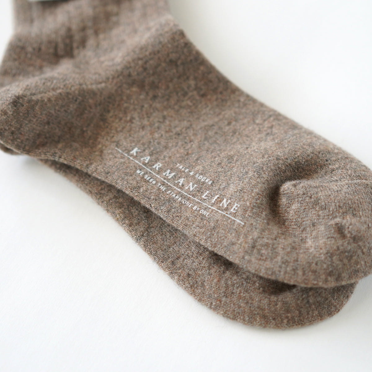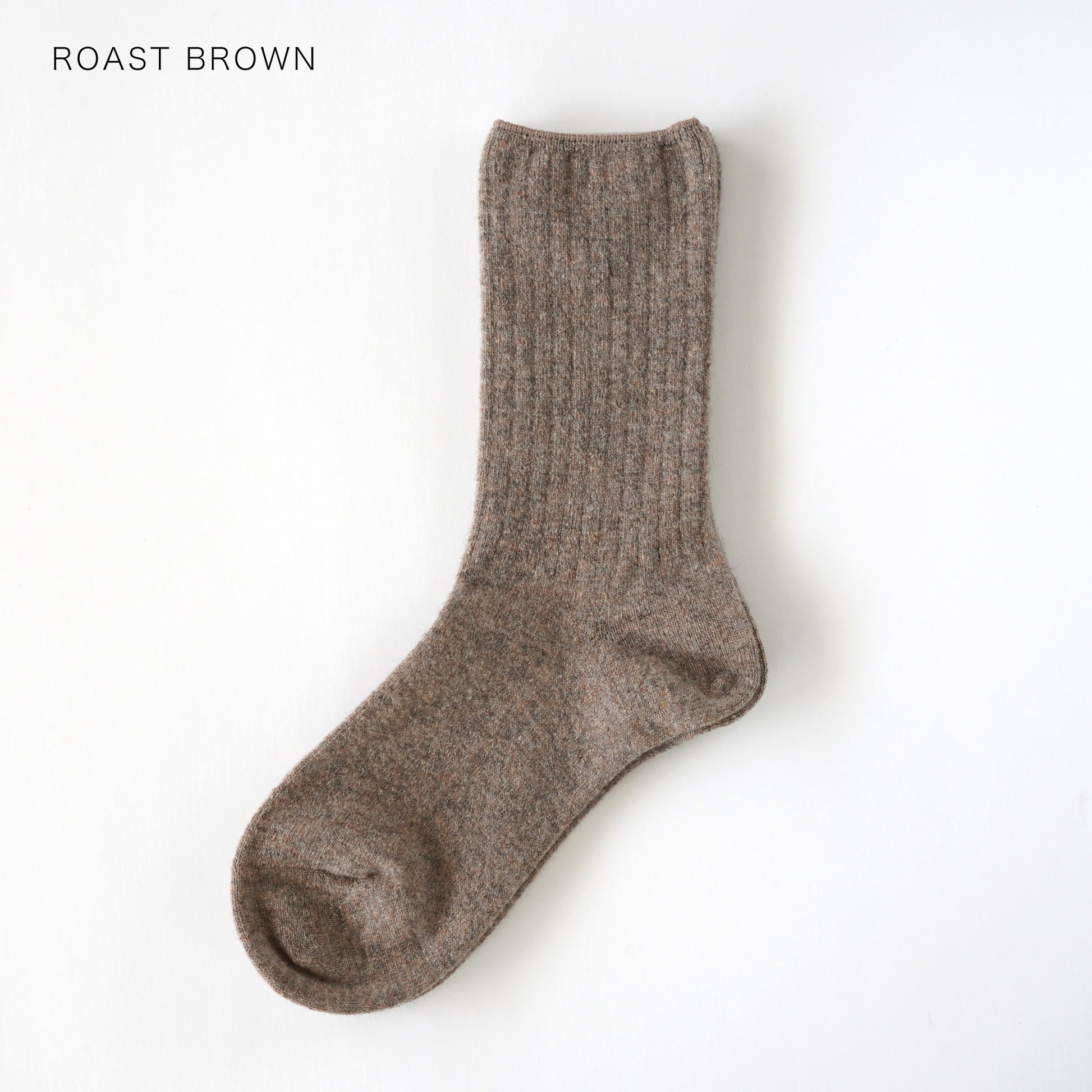 短繊維の重なりに空気が含まれるので、ミドルゲージでもちゃんと温かい一足。履き口を軽く1cmほど折り、好みの位置まで折り返してみてください。細いリブが足首の優しいアクセントになります。