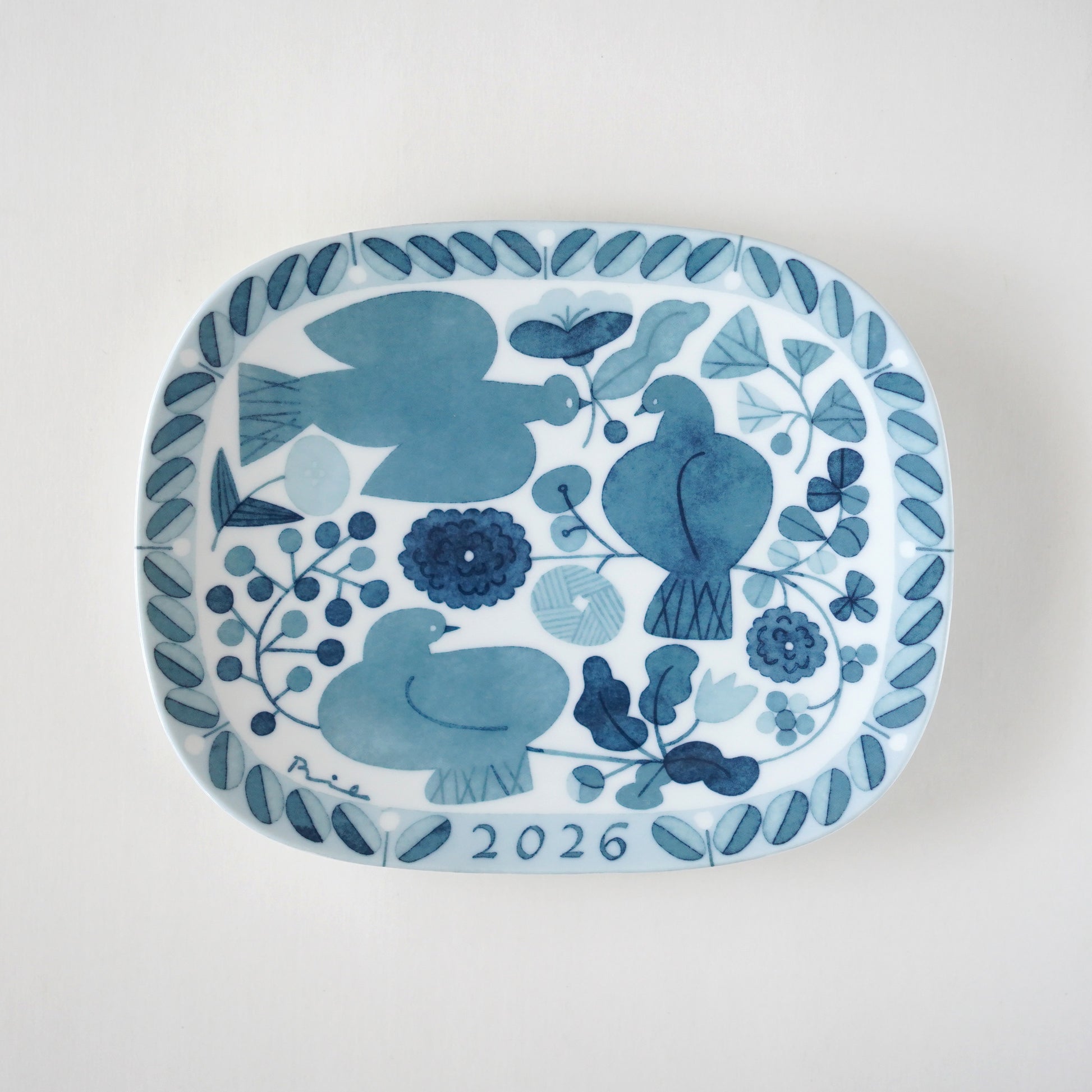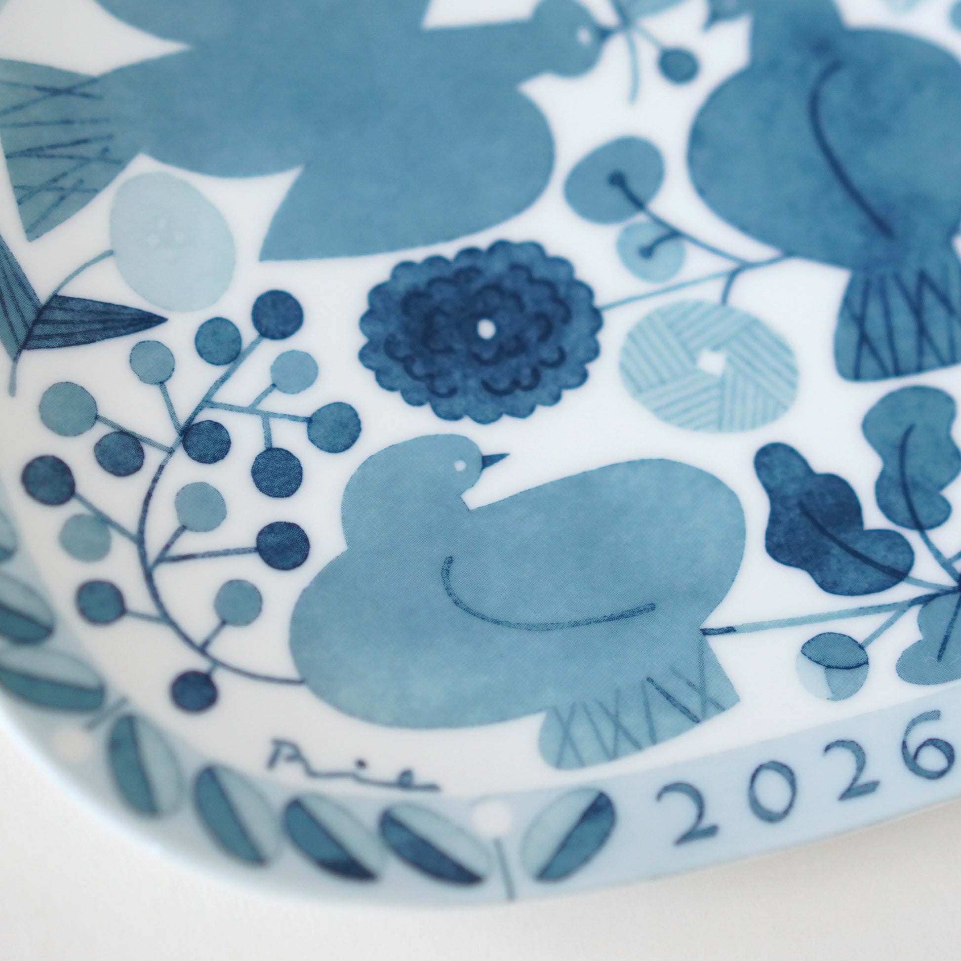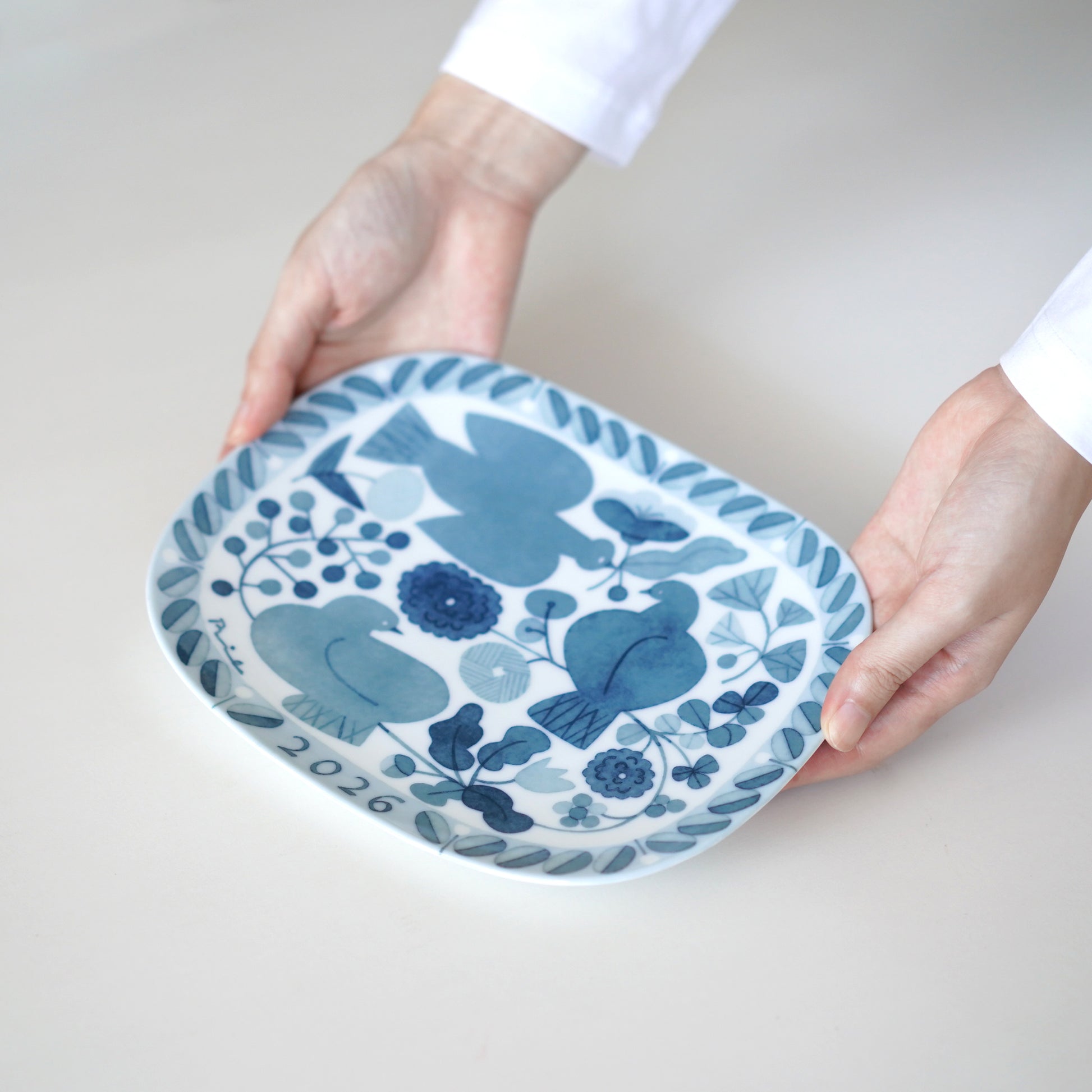 特別な年を彩るバーズワーズのイヤープレート 。縁飾りが印象的な絵柄からは、植物に囲まれながら楽しげに集う鳥たちのさえずりが聞こえてきそうです。