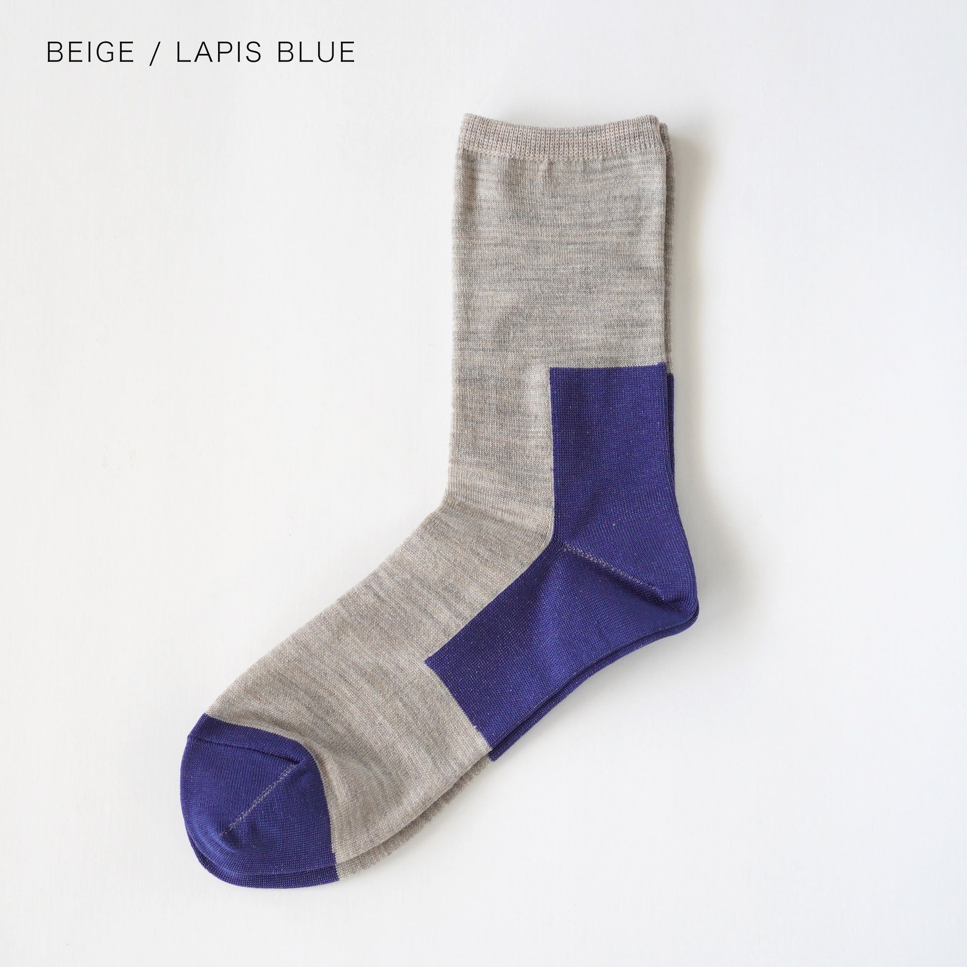少し高めに入れた切替は上品なアクセントに。ベースは高いクオリティを誇るオーストラリア産のメリノウール、爪先と踵は限られた地域で栽培され 希少かつ上質さを合わせ持つ 世界三大綿、エジプト綿を使用しています。