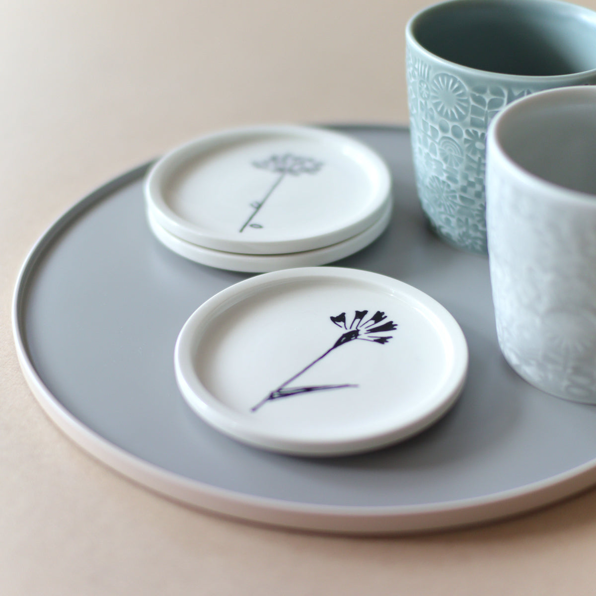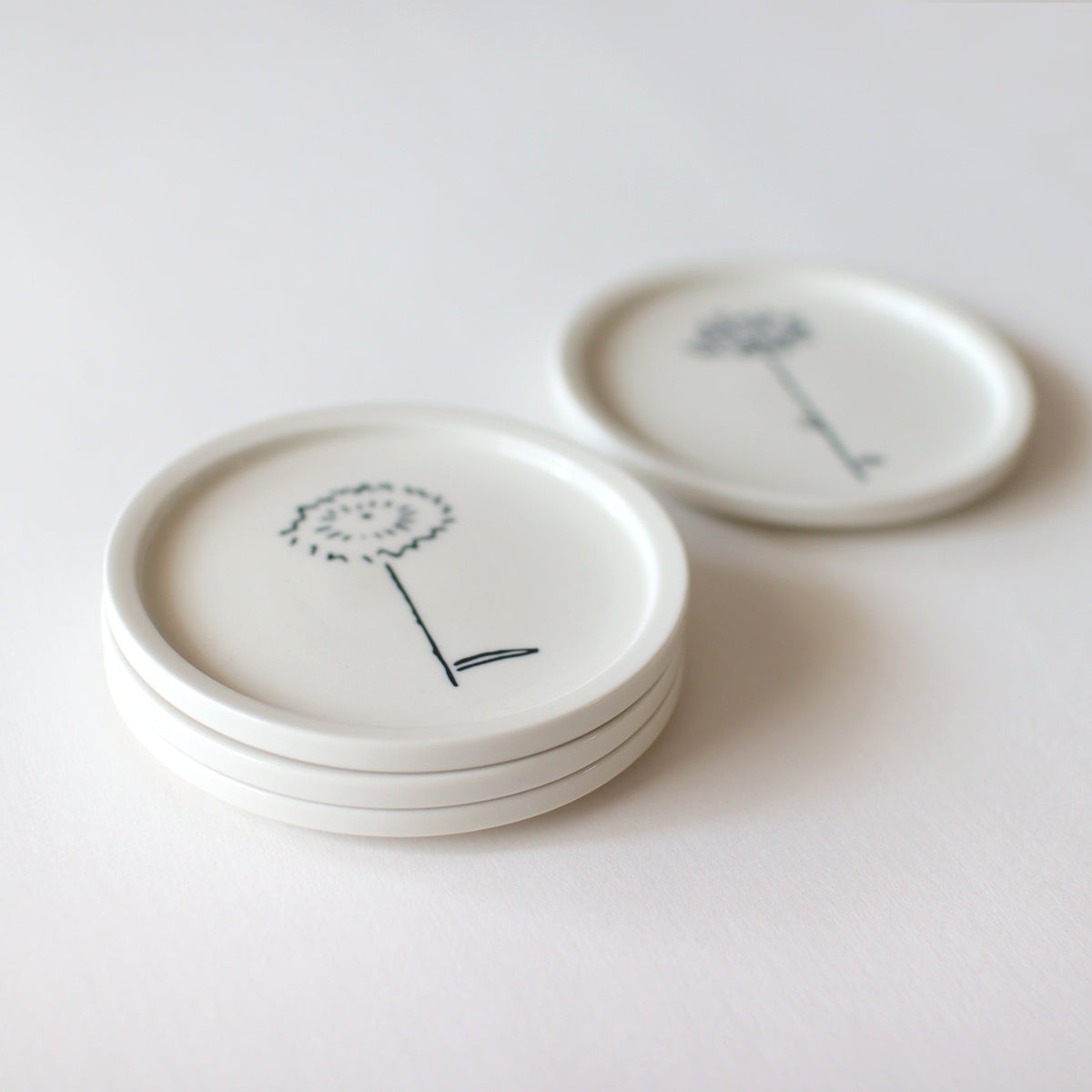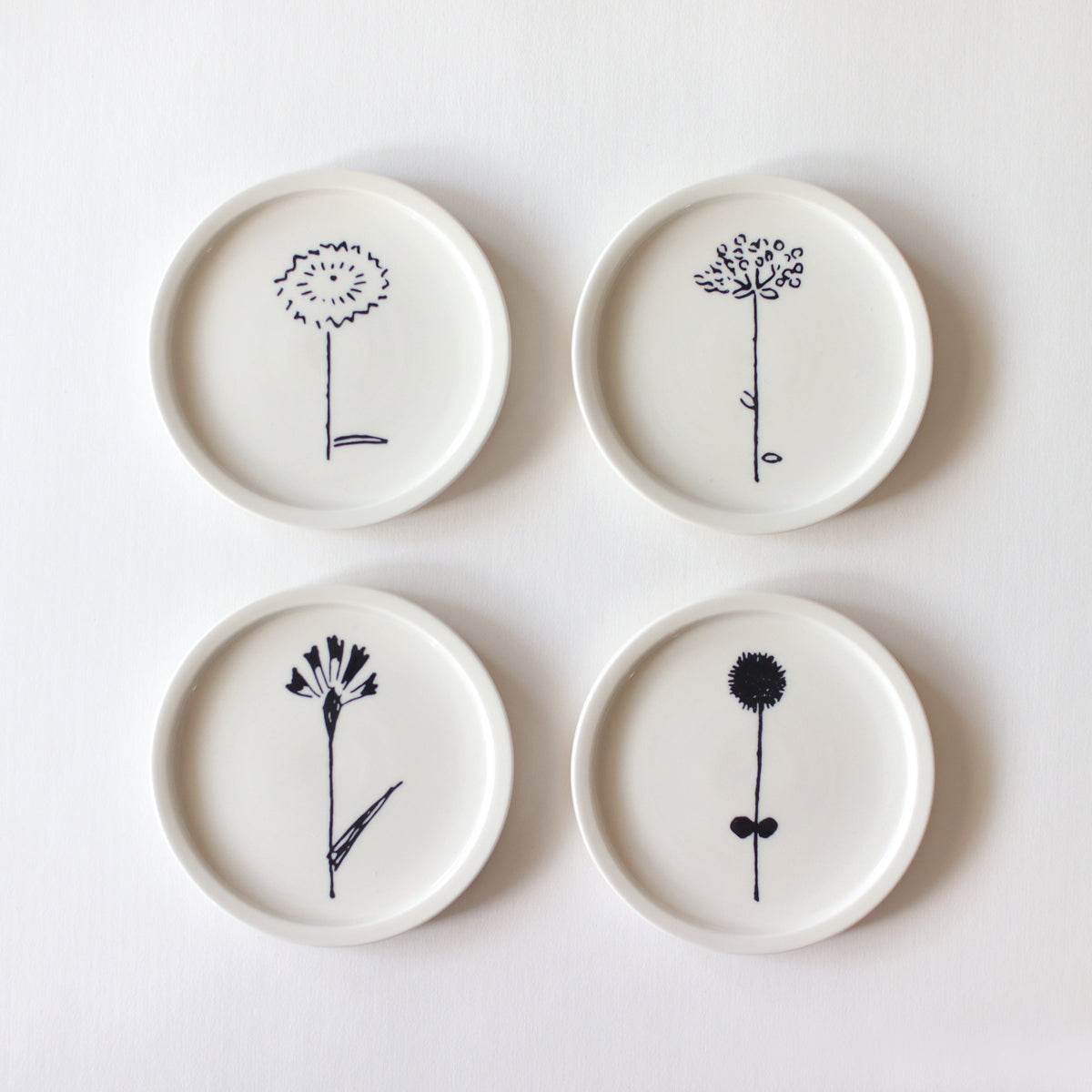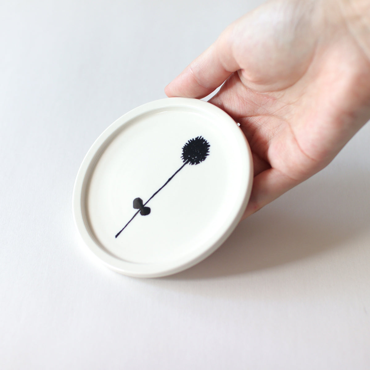 愛媛出身のアーティスト・デザイナー 石本藤雄が模型を作成し、それを元に型を製作し、細かい調整を経て生み出されました。 絵柄は、石本が暮らしの中で欠かすことのない、可憐な花々。テキスタイルや陶芸作品でも、幾度となくモチーフとしてきました。空き地や道路脇など、身近な場所で見られる花を描いています。